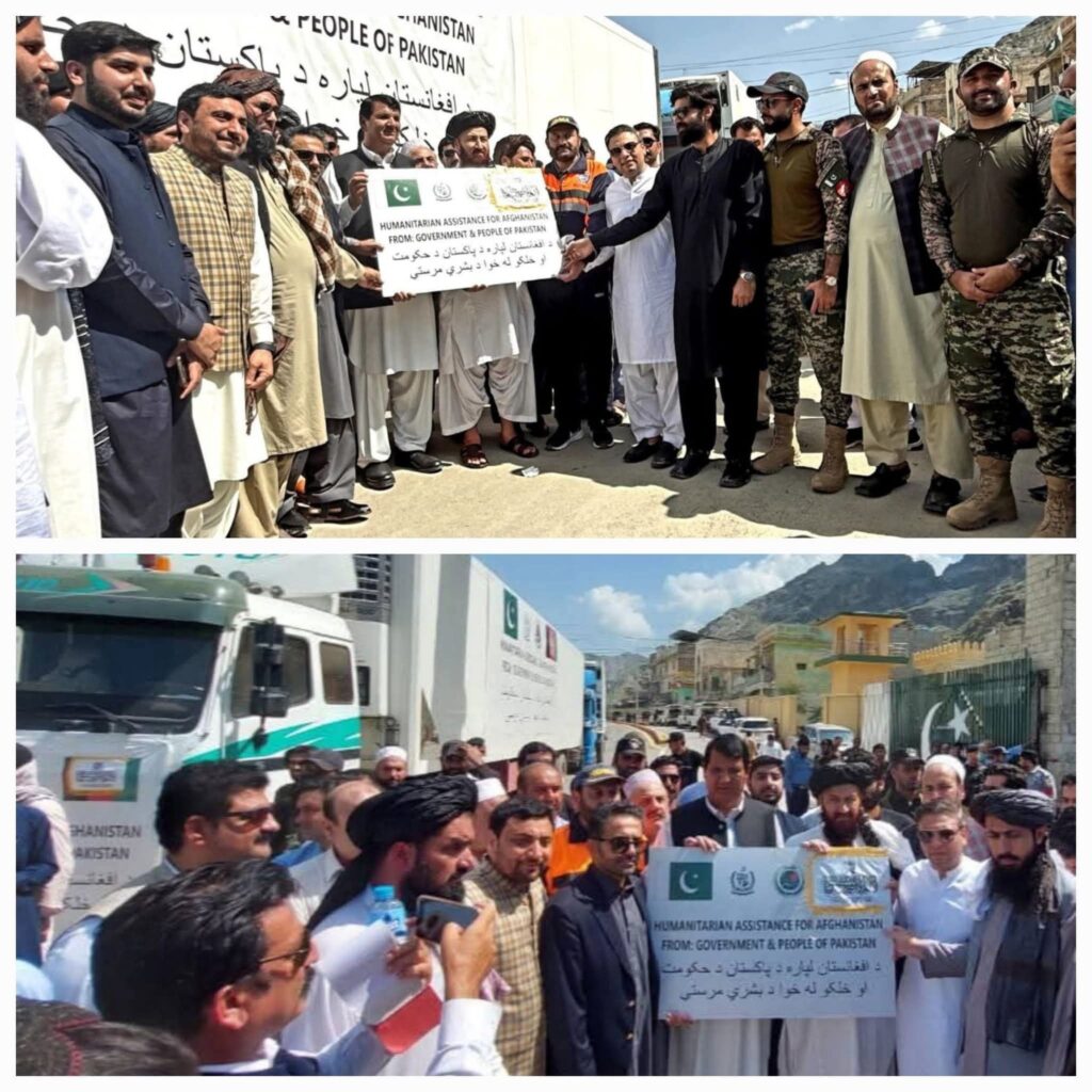 وزیراعظم پاکستان شہباز شریف کی طرف سے افغانستان زلزلہ متاثرین کے لئے 5کنٹینرز یعنی (105 ٹن) پر مشتمل امدادی سامان آج طورخم بارڈر وفاقی وزیر امیر مقام نے افغانستان کے کونسل جنرل حافظ محیب اللہ شاکر اور دیگر افغان حکام کو حوالے کر دیا گیا